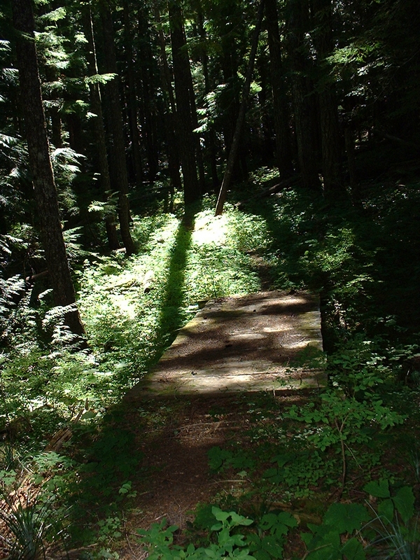 The next 3/4 mile is a climb of a couple hundred feet in elevation that runs through the forest, over a couple of small foot bridges. A very good beginner climb and nice single track that meanders west and north to turn back on its self and come back around the ridge it is following to emerge at the edge of a clear cut.