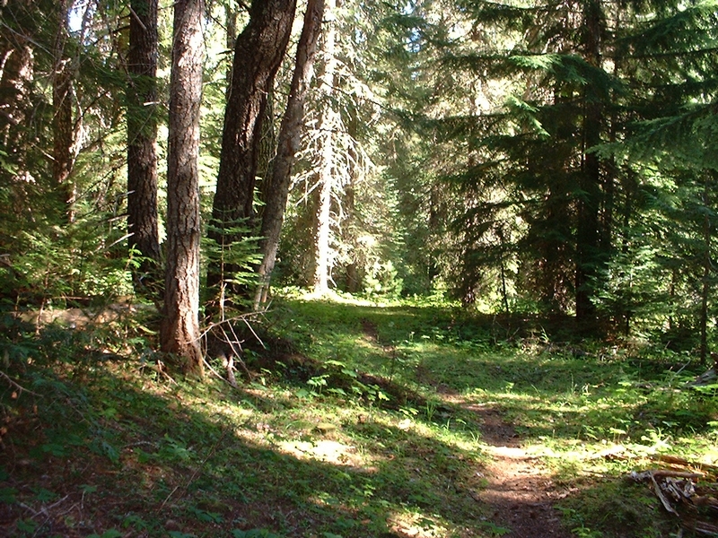 The other option would be to cross over the Wind River Highway (forest road 30) at Old Man Pass parking area, and pick up trail 150. This trail looks like an old road, with a single lane running down it. The area is wide open, and a smooth downhill run for another half mile or so. Then the ride is a moderate climb for another mile back to forest road 3053, ending just a few feet from the McClellan Meadows Snow Park parking area.